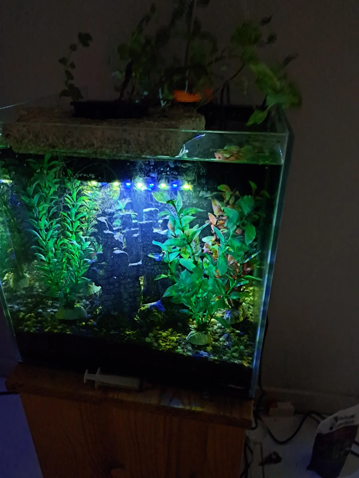 This is where I keep the fish tank away from the growing light, and away from the window, but keep the veggie area in the light.