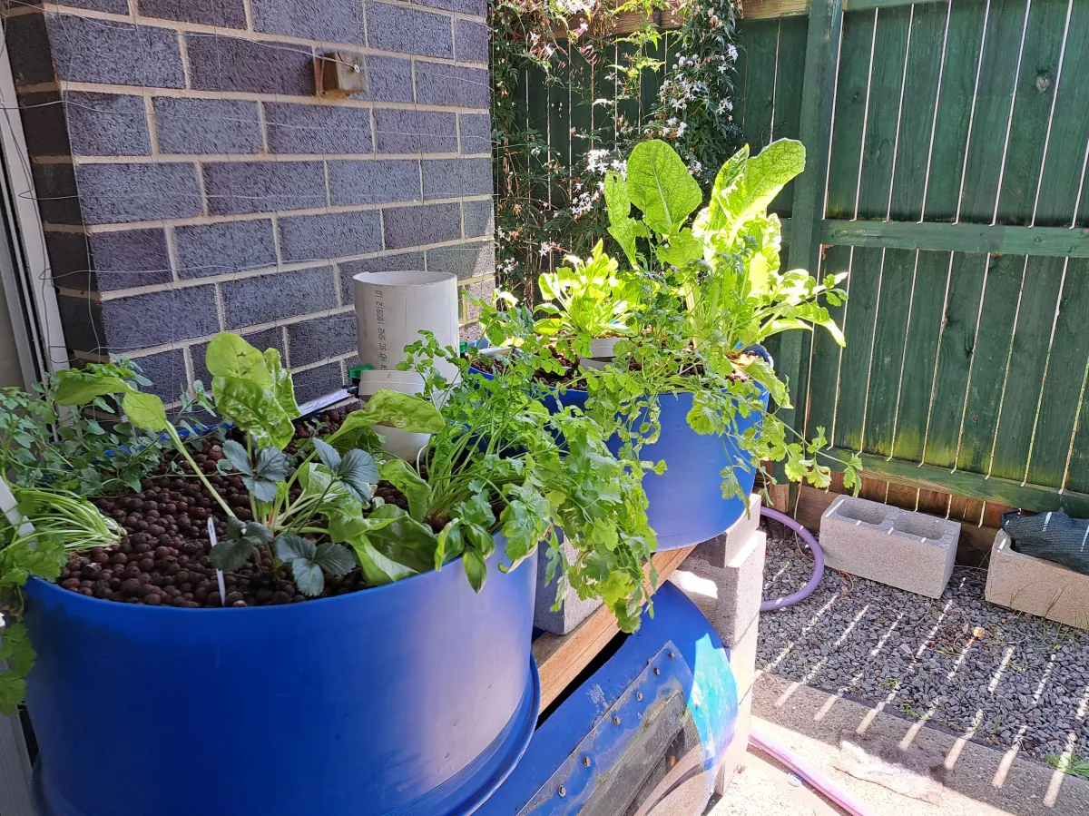 The small blue courtyard system is by my back door, growing most of my herbs and greens in a 1m x 0.75m space.