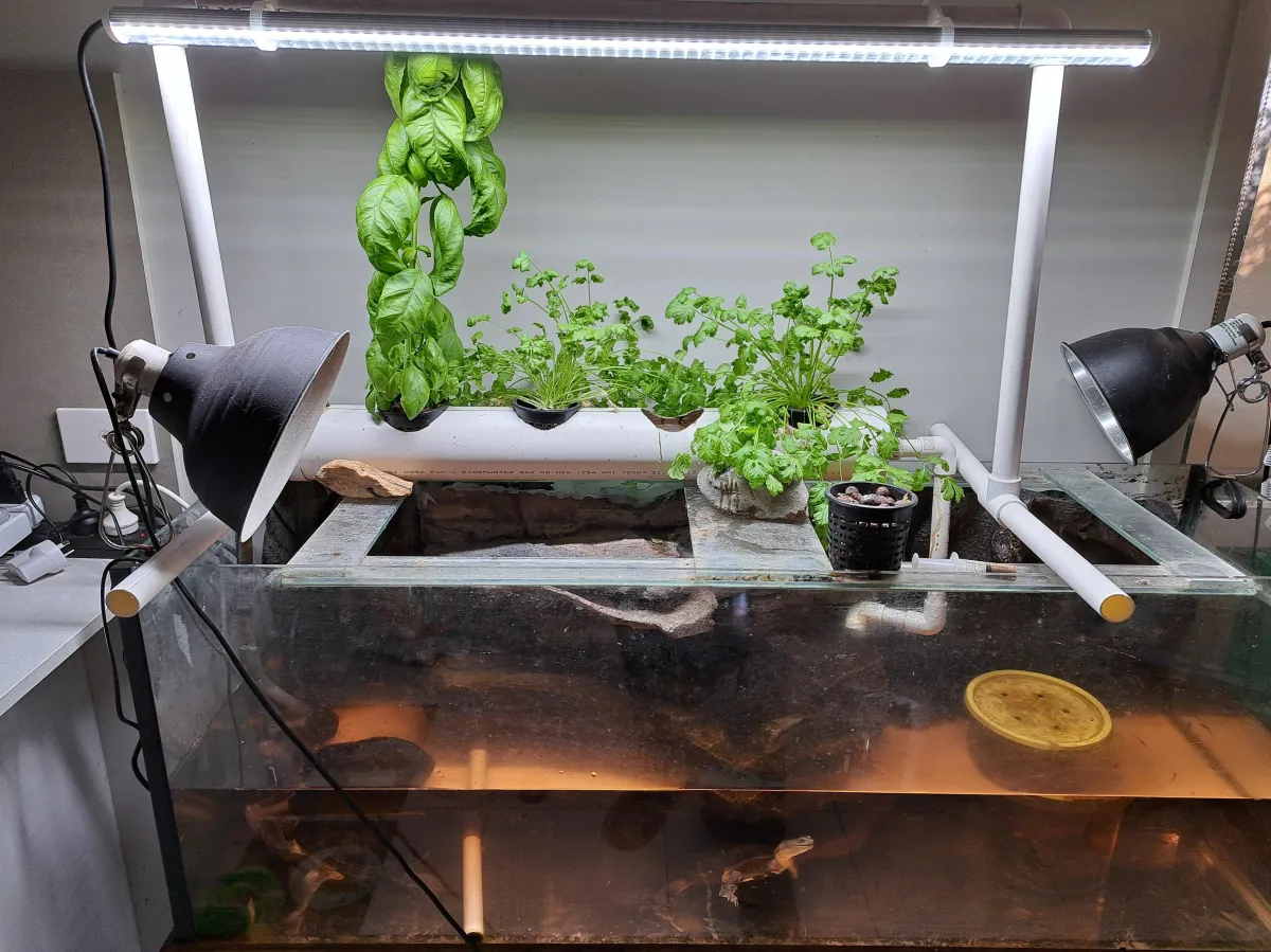 In a fish tank of 30cm x 30cm, I’ve got some herbs growing. That is very small, and you can do it with any size freshwater aquarium. Convert it over.